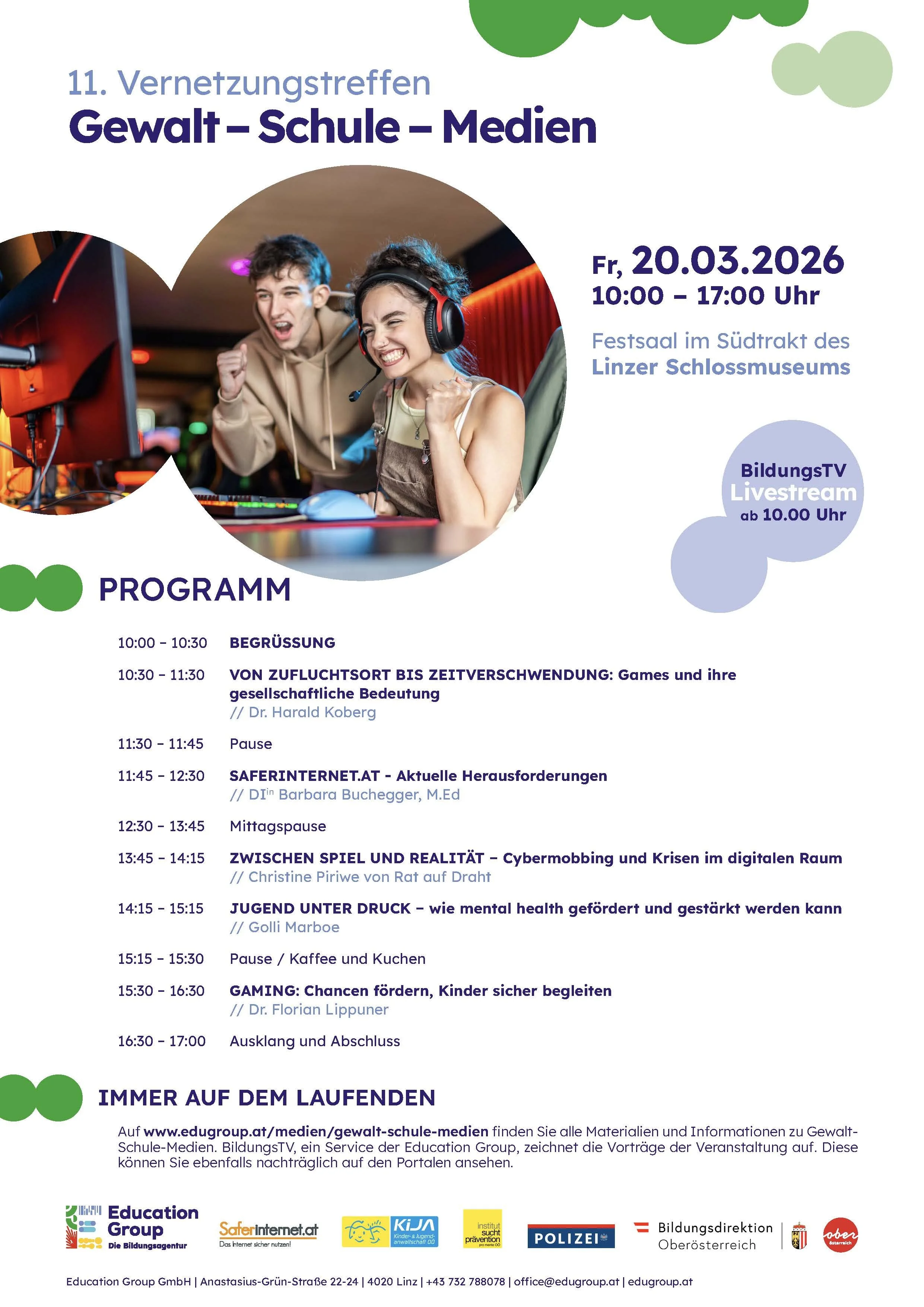 Die Veranstaltung am 20. März 2026 im Schlossmuseum Linz widmete sich ganz den Themen Online-Gaming und Cybermobbing. Spannende Keynotes, fachlicher Austausch und wertvolle Impulse für die Praxis prägten das Programm. Alle Vorträge stehen in Kürze zum Nachsehen bereit.