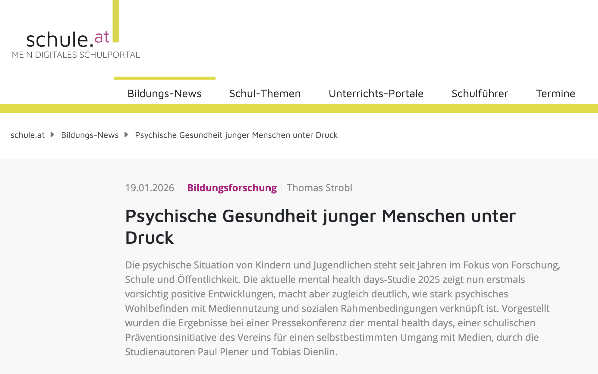 Die psychische Situation von Kindern und Jugendlichen steht seit Jahren im Fokus von Forschung, Schule und Öffentlichkeit. Die aktuelle mental health days-Studie 2025 zeigt nun erstmals vorsichtig positive Entwicklungen, macht aber zugleich deutlich, wie stark psychisches Wohlbefinden mit Mediennutzung und sozialen Rahmenbedingungen verknüpft ist. Vorgestellt wurden die Ergebnisse bei einer Pressekonferenz der mental health days, einer schulischen Präventionsinitiative des Vereins für einen selbstbestimmten Umgang mit Medien, durch die Studienautoren Paul Plener und Tobias Dienlin.